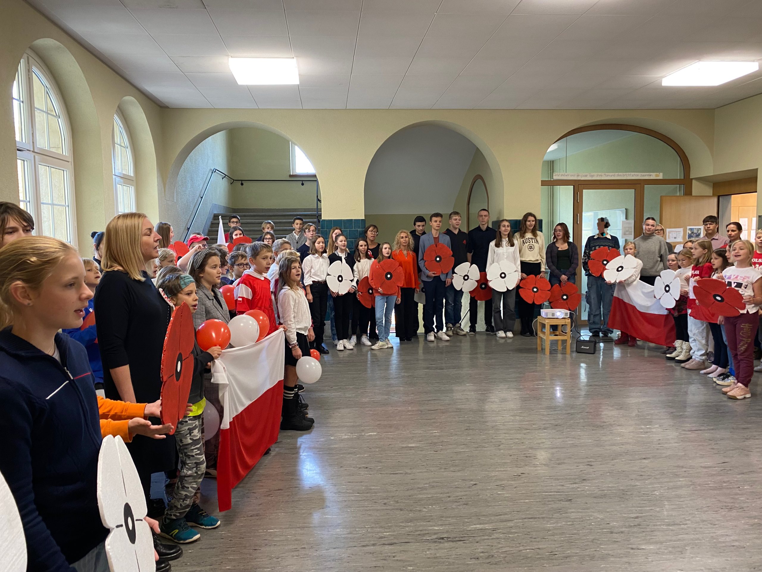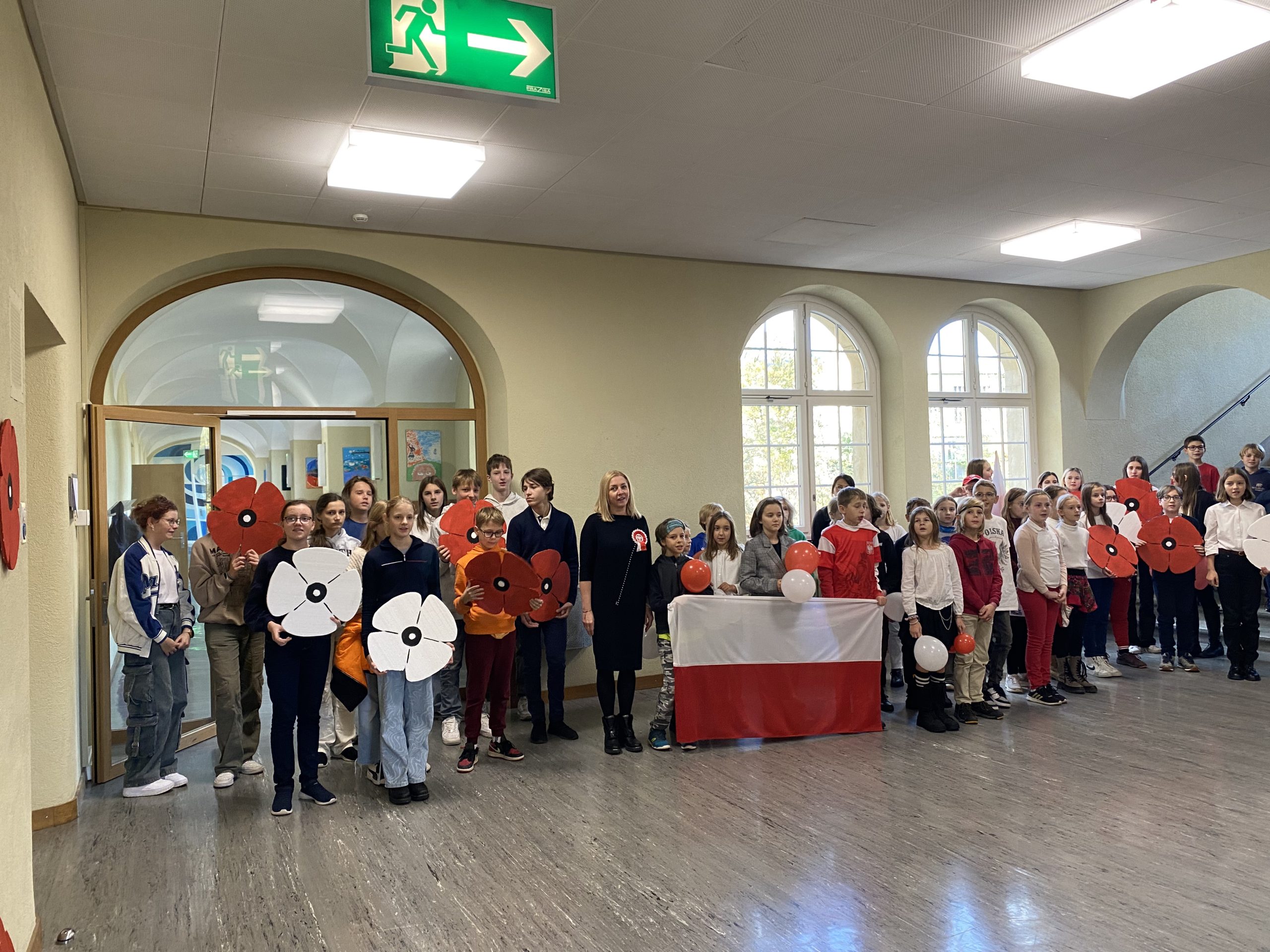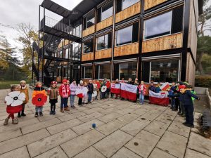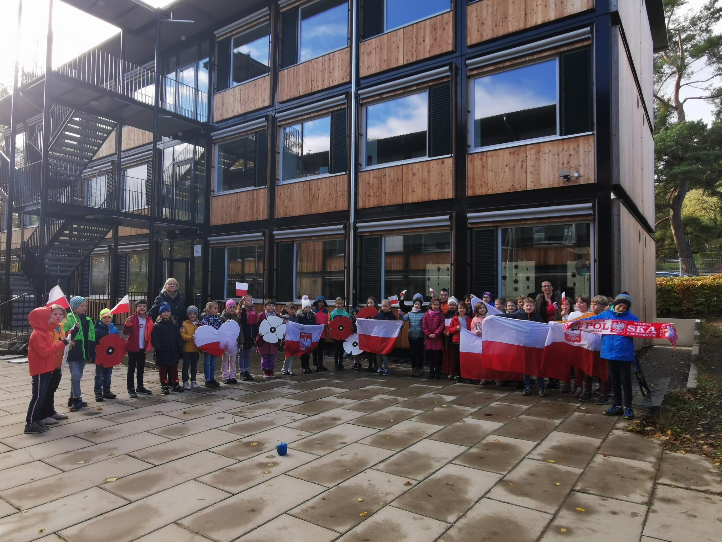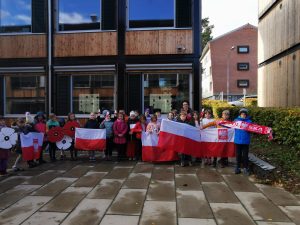 Uczniowie naszej szkoły przynieśli polskie flagi i odśpiewali hymn, świętując w ten sposób Narodowe Święto Niepodległości.