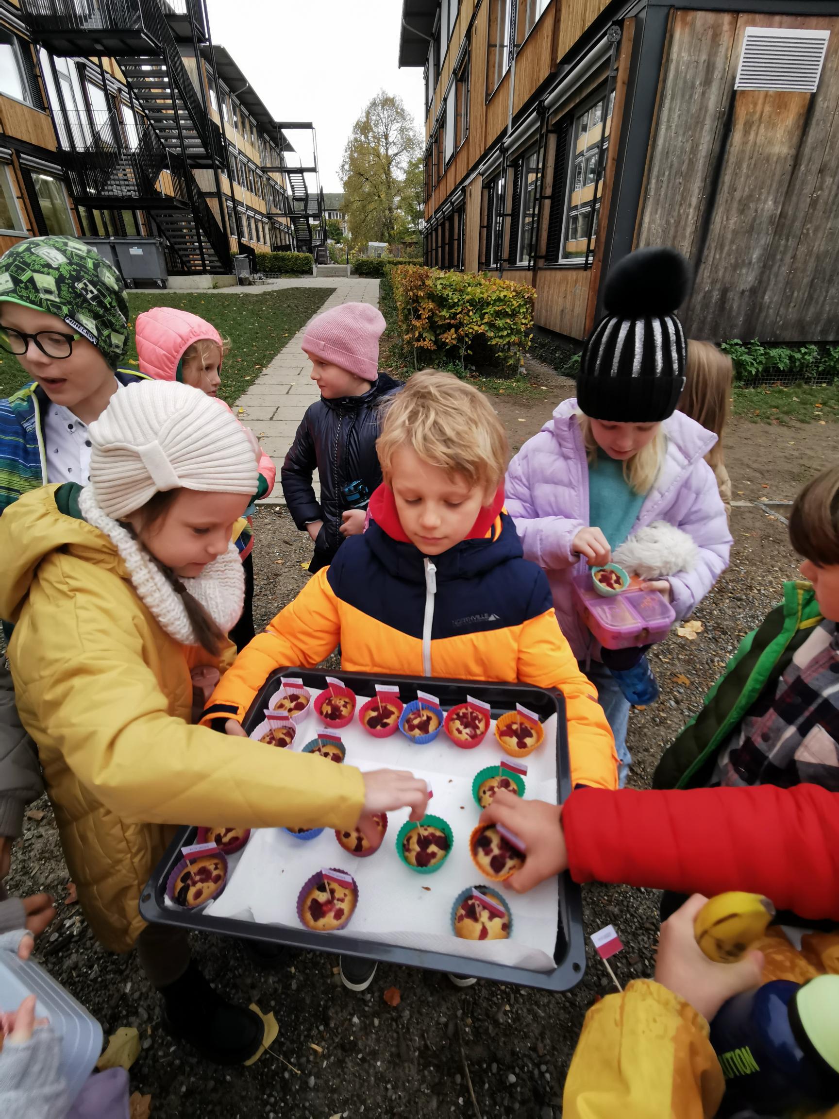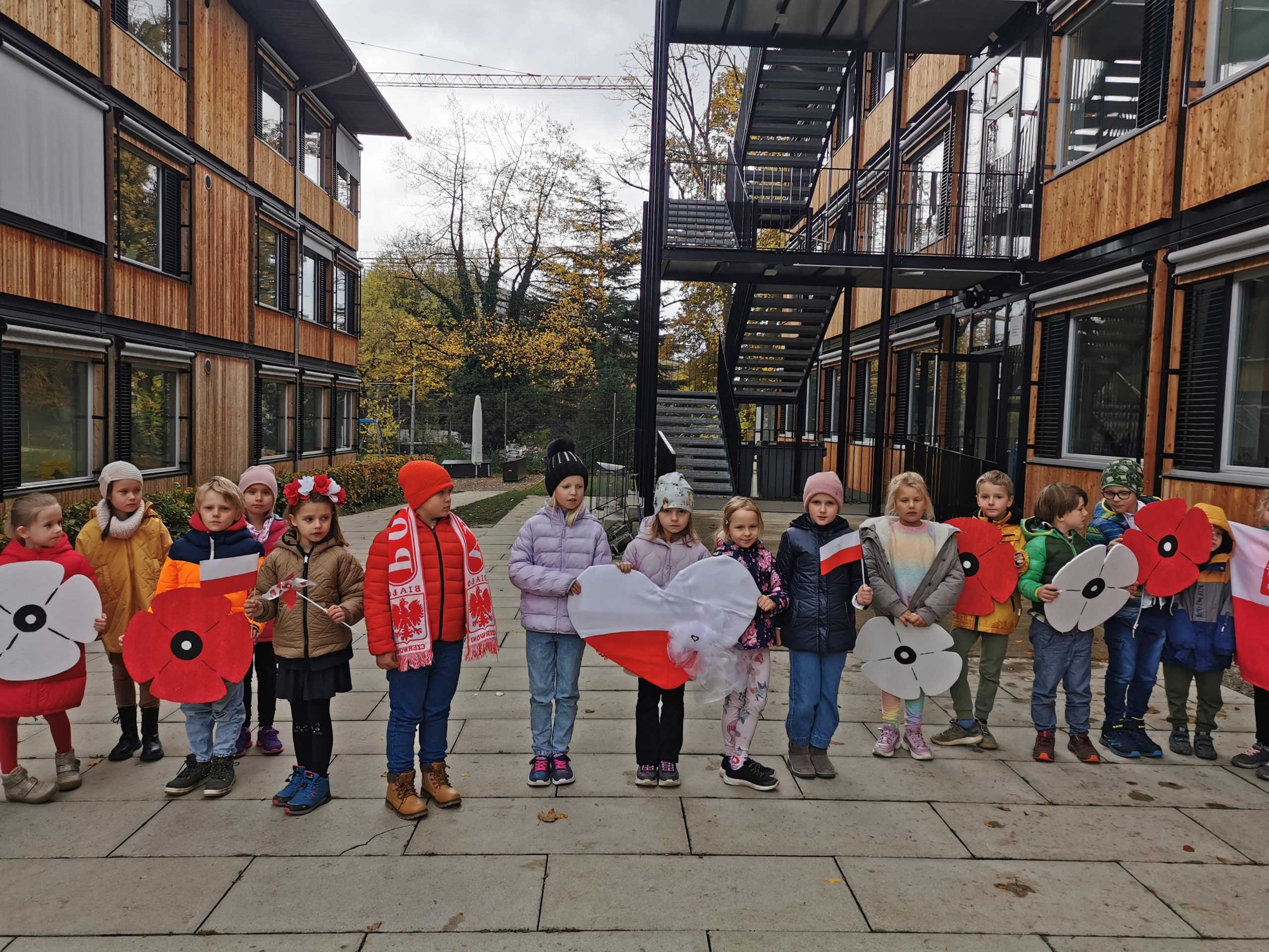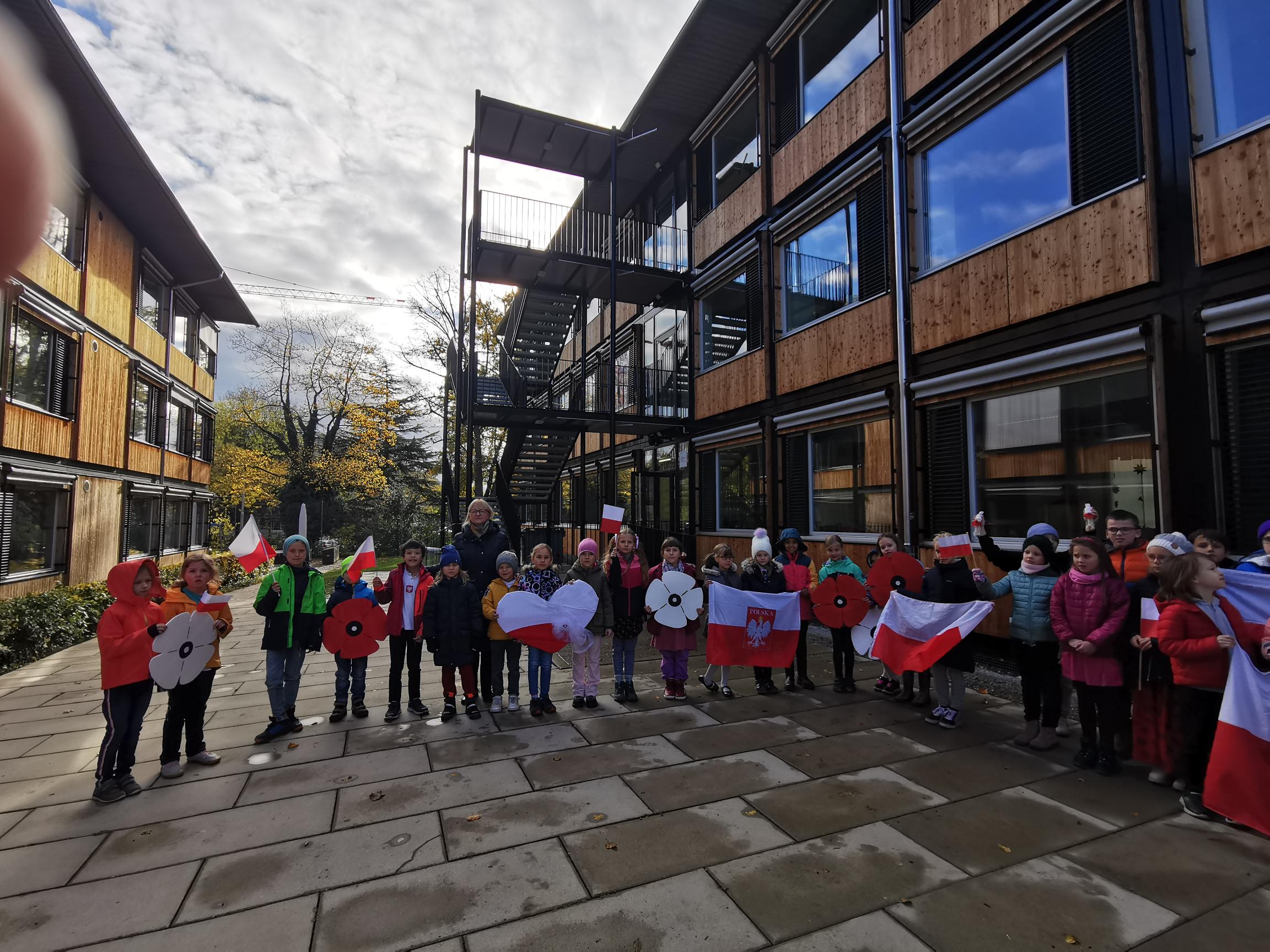 Uczniowie naszej szkoły przynieśli polskie flagi i odśpiewali hymn, świętując w ten sposób Narodowe Święto Niepodległości.