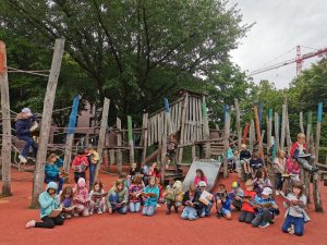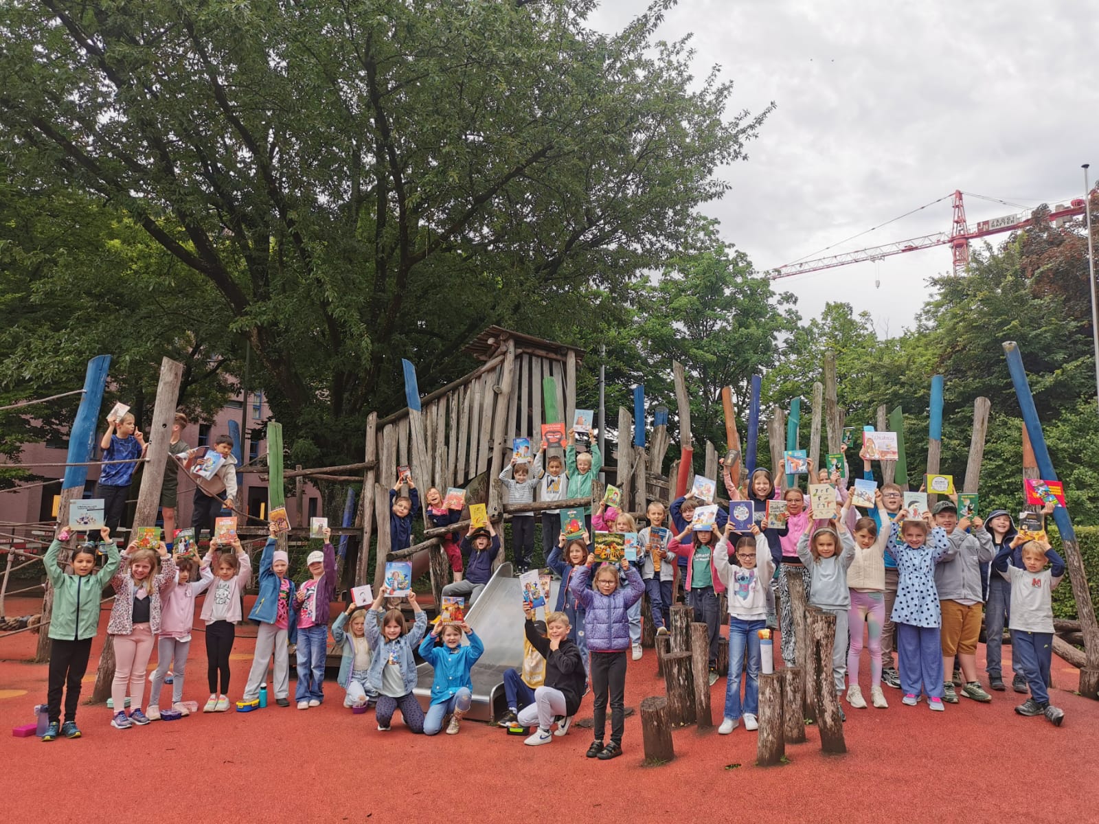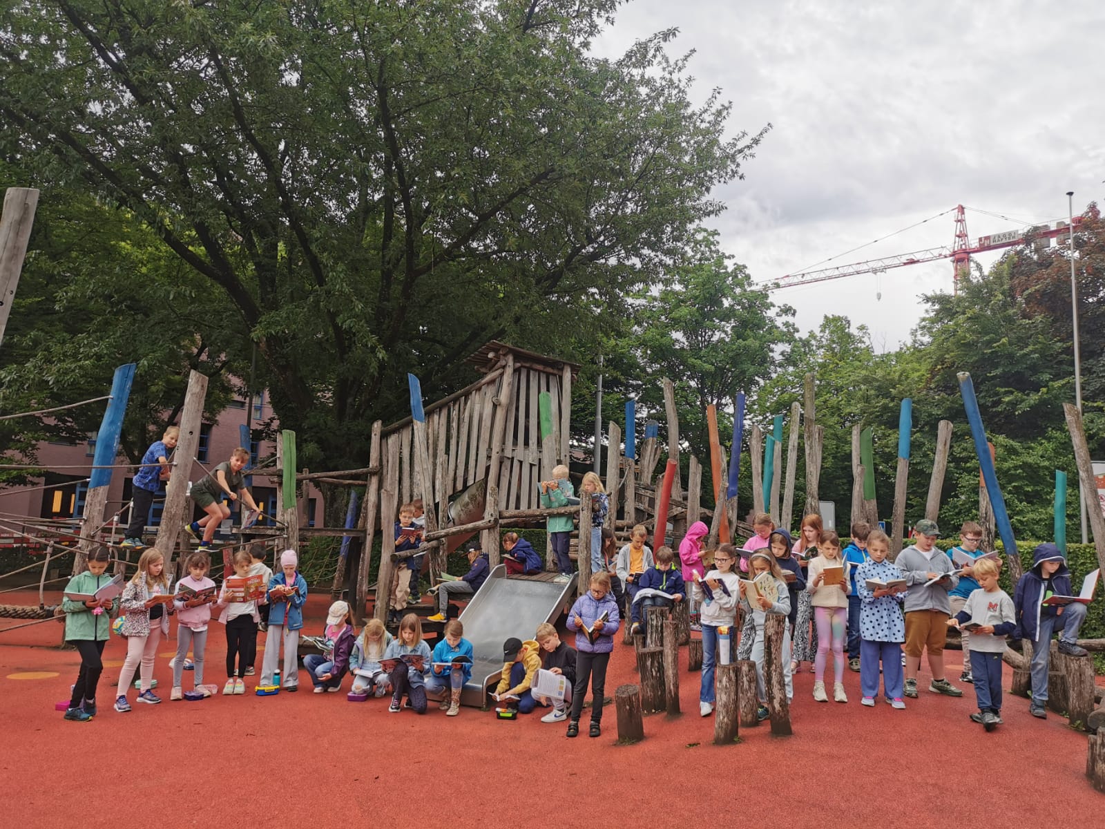 Pomimo zmiennej pogody udało nam się zgromadzić na szkolnym placu grupę młodych czytelników, którzy z zapałem i entuzjazmem czytali swoje ulubione książki (oczywiście w języku polskim!).